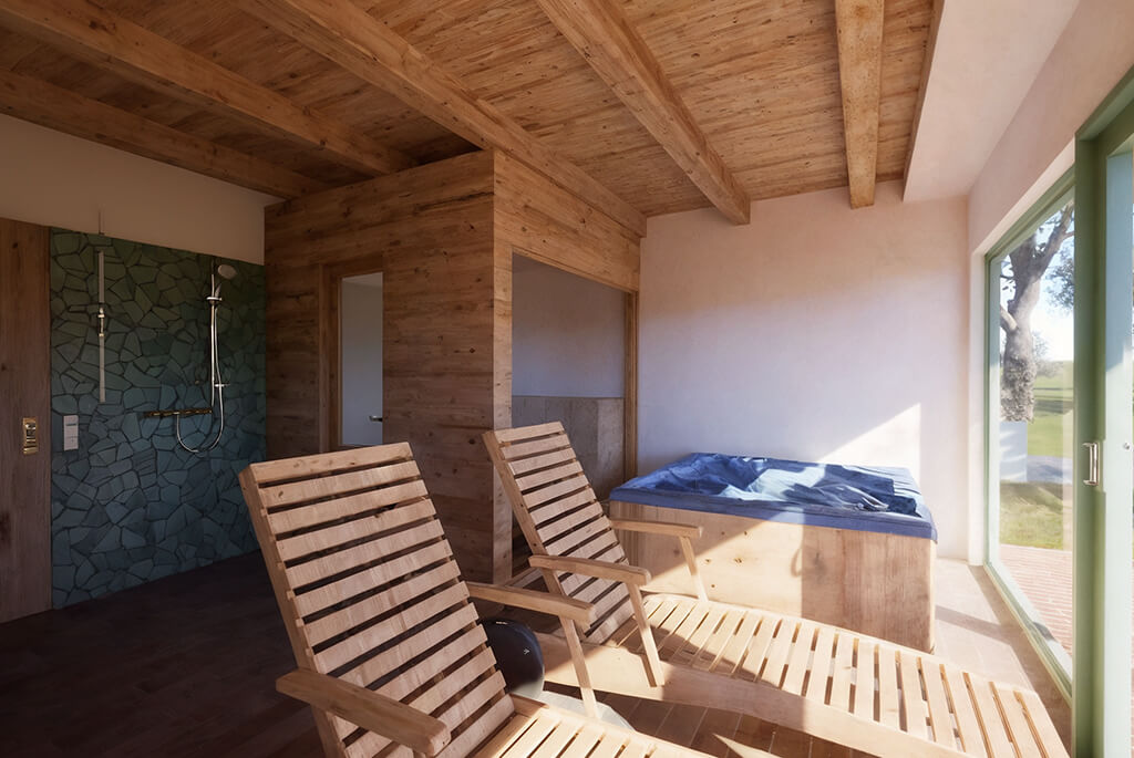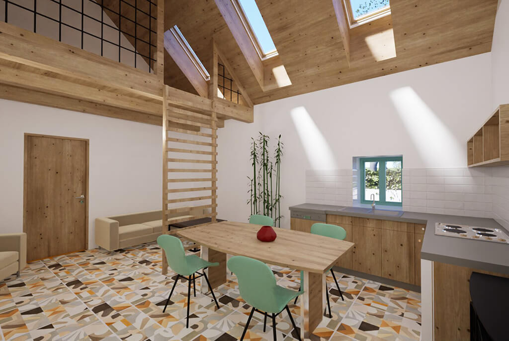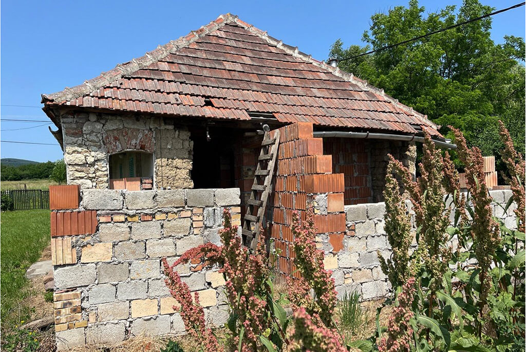 Itt található a vendégház wellness helysége is. A központi tér, ami korábban is konyha-étkező-nappali volt, megmaradt funkcióját tekintve, de a födémet részben elbontottuk és egy galériát alakítottunk ki gyerekek számára. Az épületet korszerűsítettük napelemekkel, de meghagytuk a lehetőséget -egy sparhelt beépítésével- hogy aki szeretne fával fűtsön, tűzön főzzön.A telek nagy, az épület kicsi, ideális elvonulásra a természetbe, megidézve régi korok emlékét.